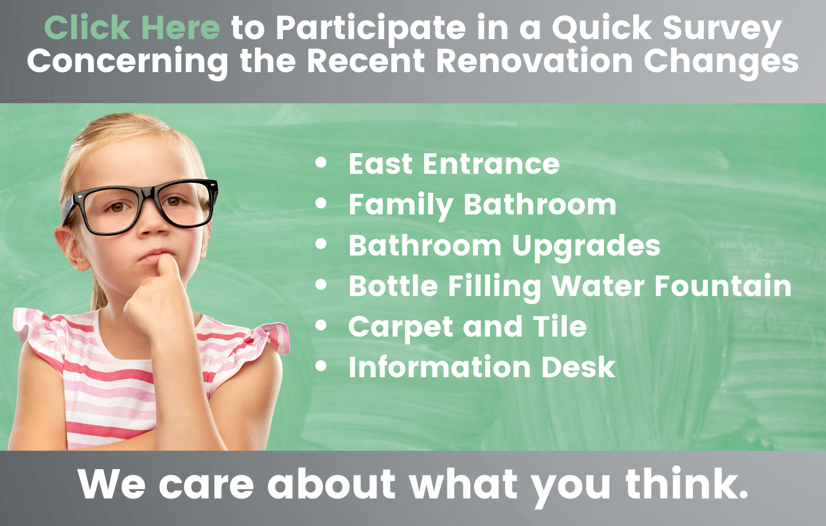 We care about what you think and invite you to complete the quick survey to the left. Please let us know what matters to you and how we can serve you better.