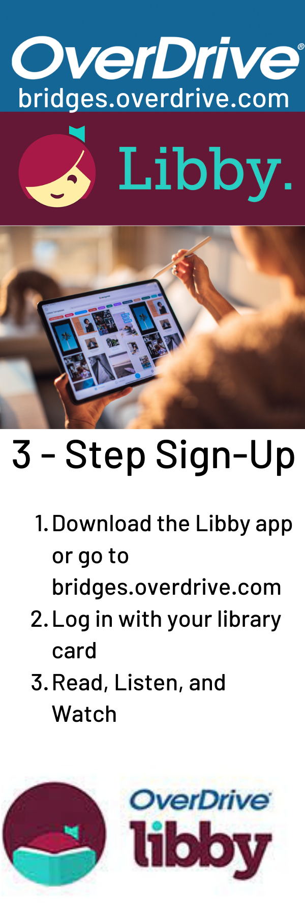The Libby(Bridges/OverDrive) offers library cardholders eBooks, eAudiobooks, eMagazines, eMovies, eMusic, and eLearning.