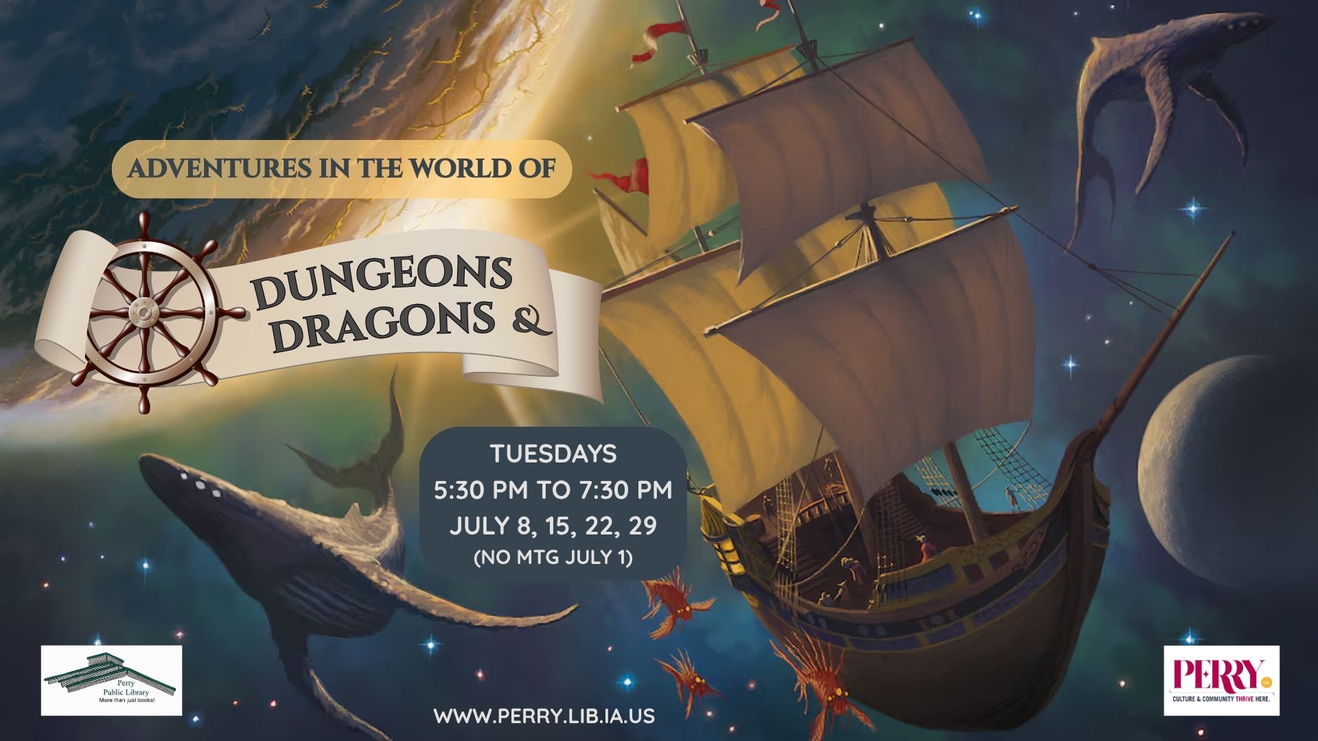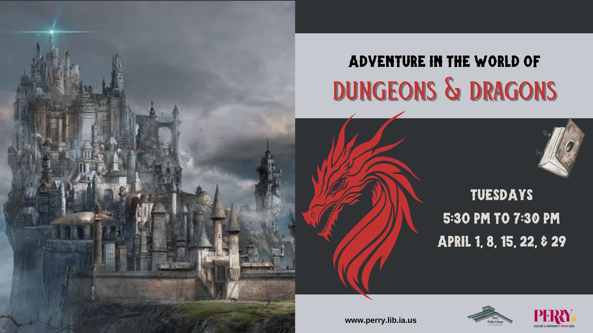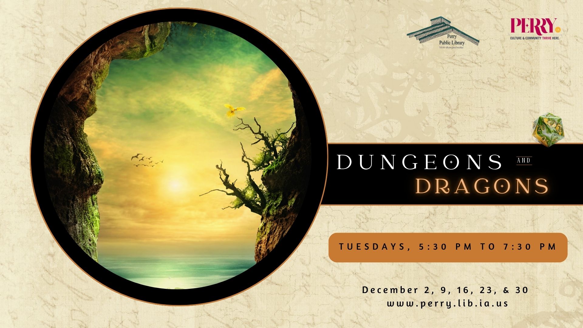 Welcome to a world of Dungeons and Dragons! Dungeons and Dragons is a communal storytelling adventure where you get to play a character of your own creation and make decisions (and rolls) to decide the path of our story and the destiny of your character! Our adventures will be enjoyable for newcomers and experienced players alike. Patrons 10+ are invited to join us as we venture into exciting campaigns in the Perry Public Library Community Room on Tuesday nights in December from 5:30 pm to 7:30 pm. This is a free program and no registration is required. For more information, go to www.perry.lib.ia.us, visit the library, or call 515-465-3569.