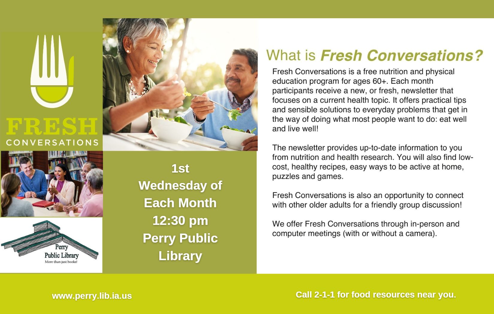 Fresh Conversations is a free nutrition and physical education program for ages 60+. The program offers practical tips and sensible solutions to everyday problems that get in the way of doing what most people want to do: eat well and live well! Fresh Conversations is also an opportunity to connect with other adults for a friendly group discussion. We will meet the first Wednesday of the month from 12:30 pm to 1:30 pm in the Perry Public Library Community Room. This is a monthly, free event for ages 60+ and no registration is required. For more information, call the library at 515-465-3569 or visit www.perry.lib.ia.us.
