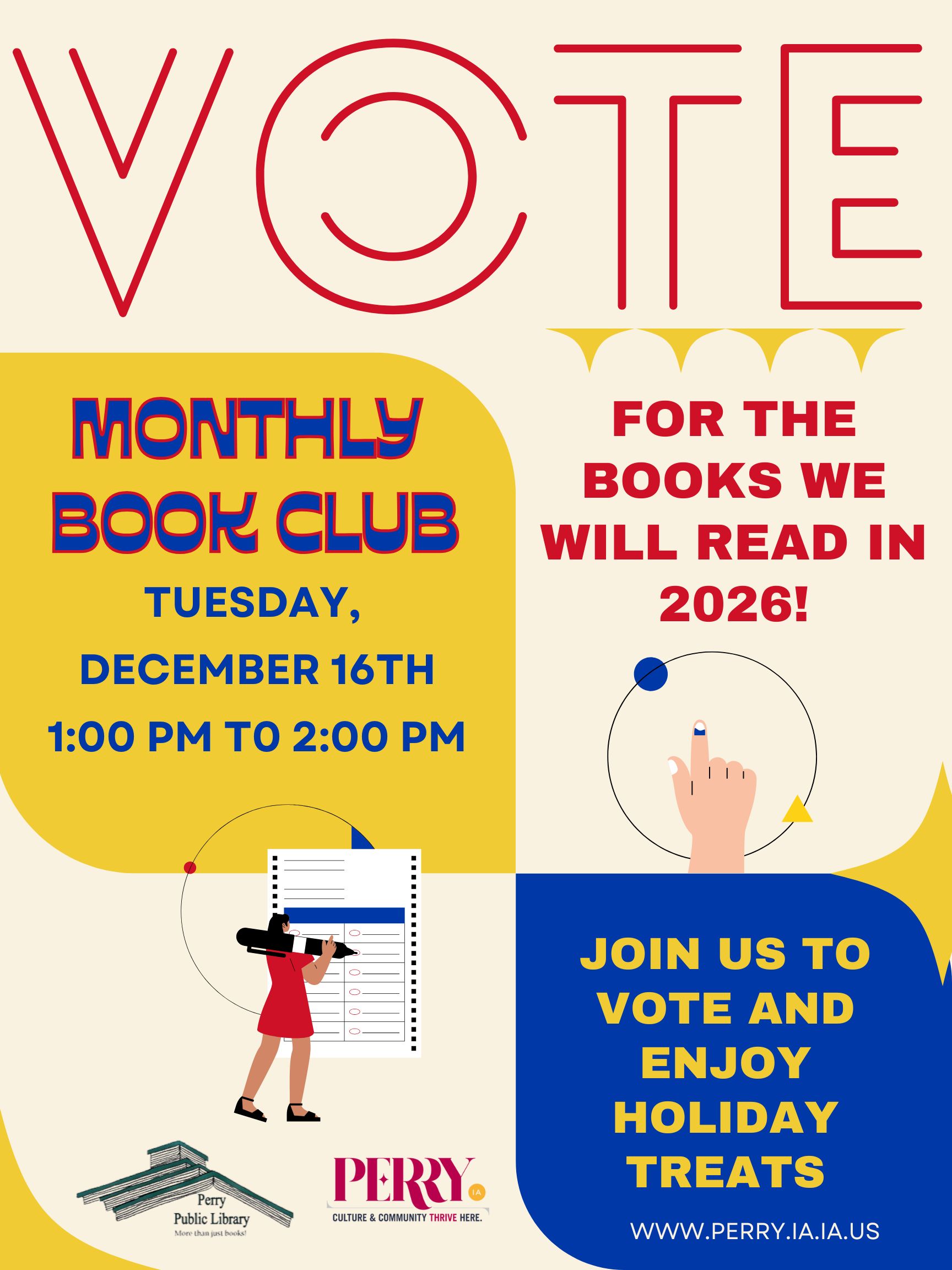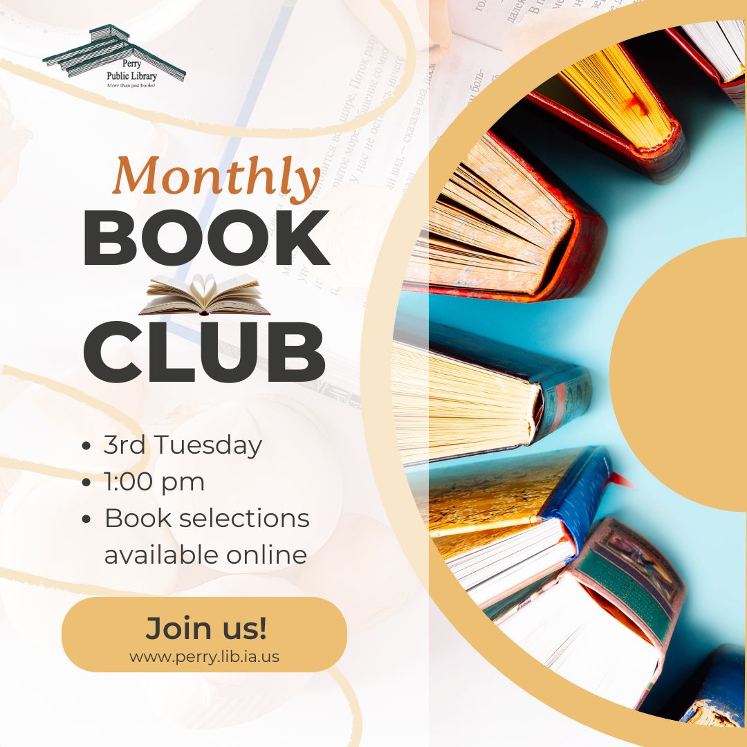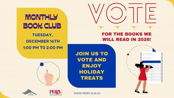 The Monthly Book Discussion mixes good books and good conversation! This group meets at 1:00 pm on the third Tuesday of each month in the Library Community Room. Books are available for purchase at a reduced cost or can be checked out when available. For more information, contact Mindy Farmer at 515-465-3569 or mindy.farmer@perryia.org.