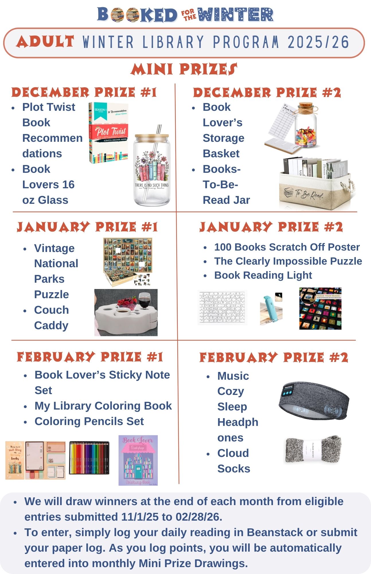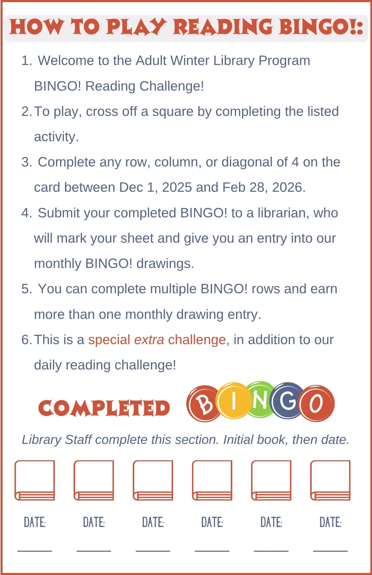 The Adult Winter Reading Program will be from December 1, 2025, through February 28, 2026.