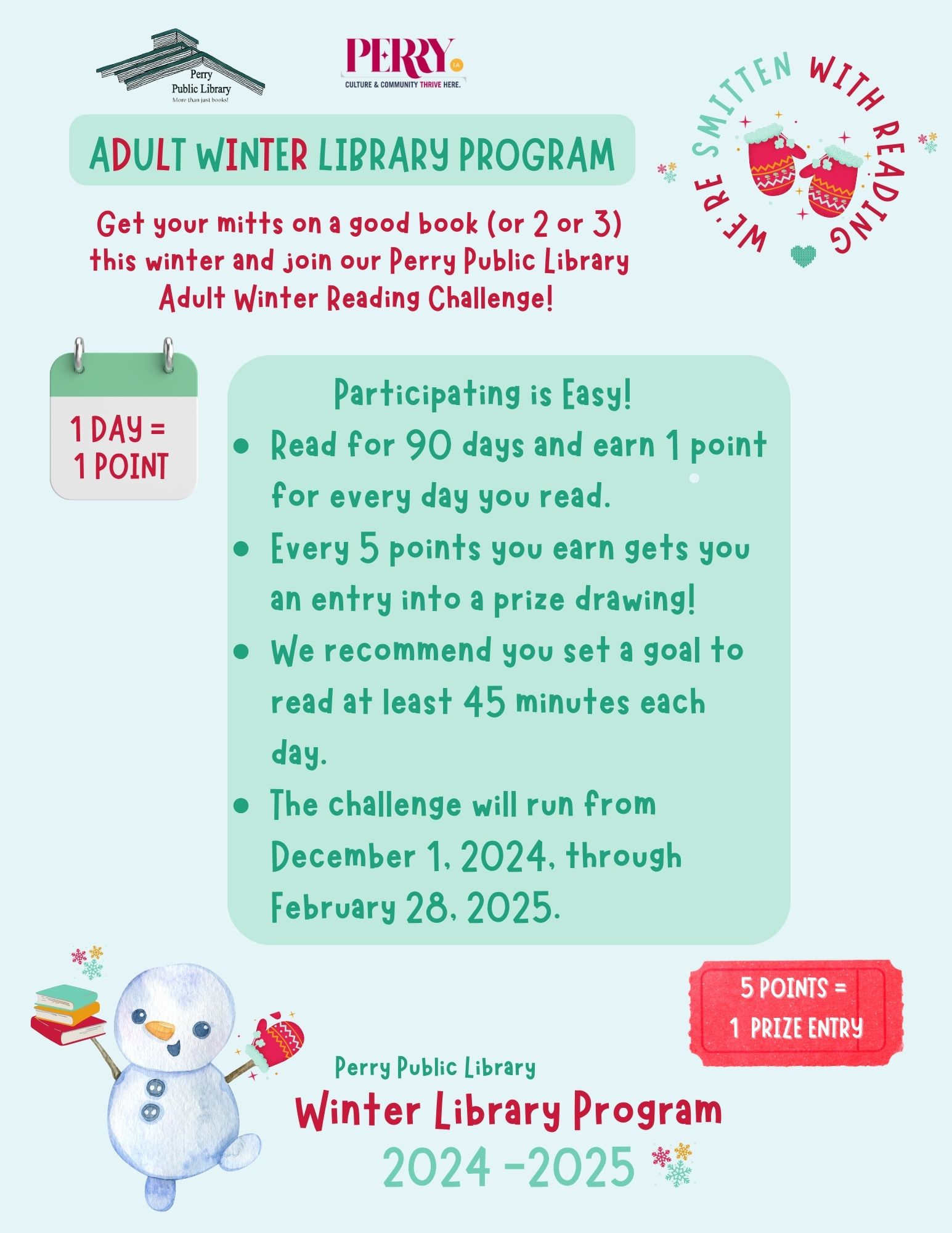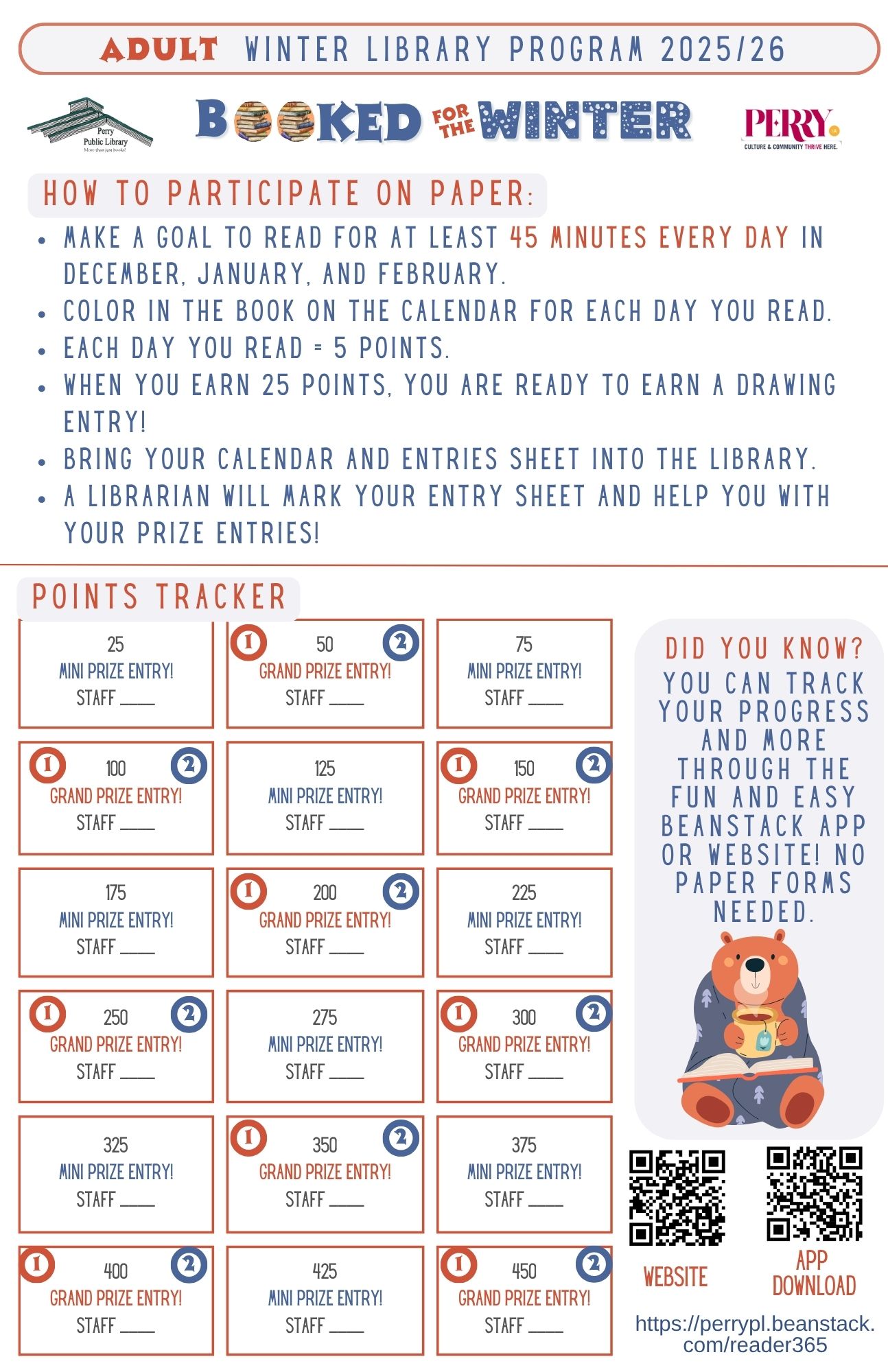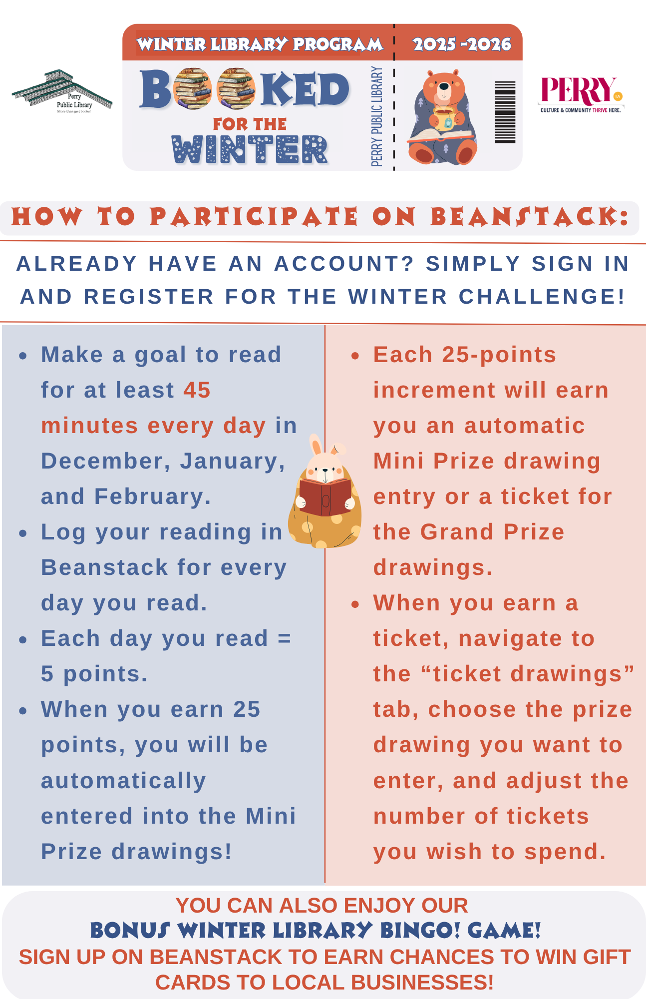 We're "Booked for the Winter" at the Perry Public Library from December 1st, 2025, until February 28th, 2026! You're invited to join our one of our Adult, Teen, or Children’s Winter Library Programs. Participants can register beginning December 1st and start earning points just for enjoying the perfect winter activity - reading! To participate, simply track each day you read on paper or on the Beanstack app. You'll earn points toward fun prizes and awesome grand prize entries!