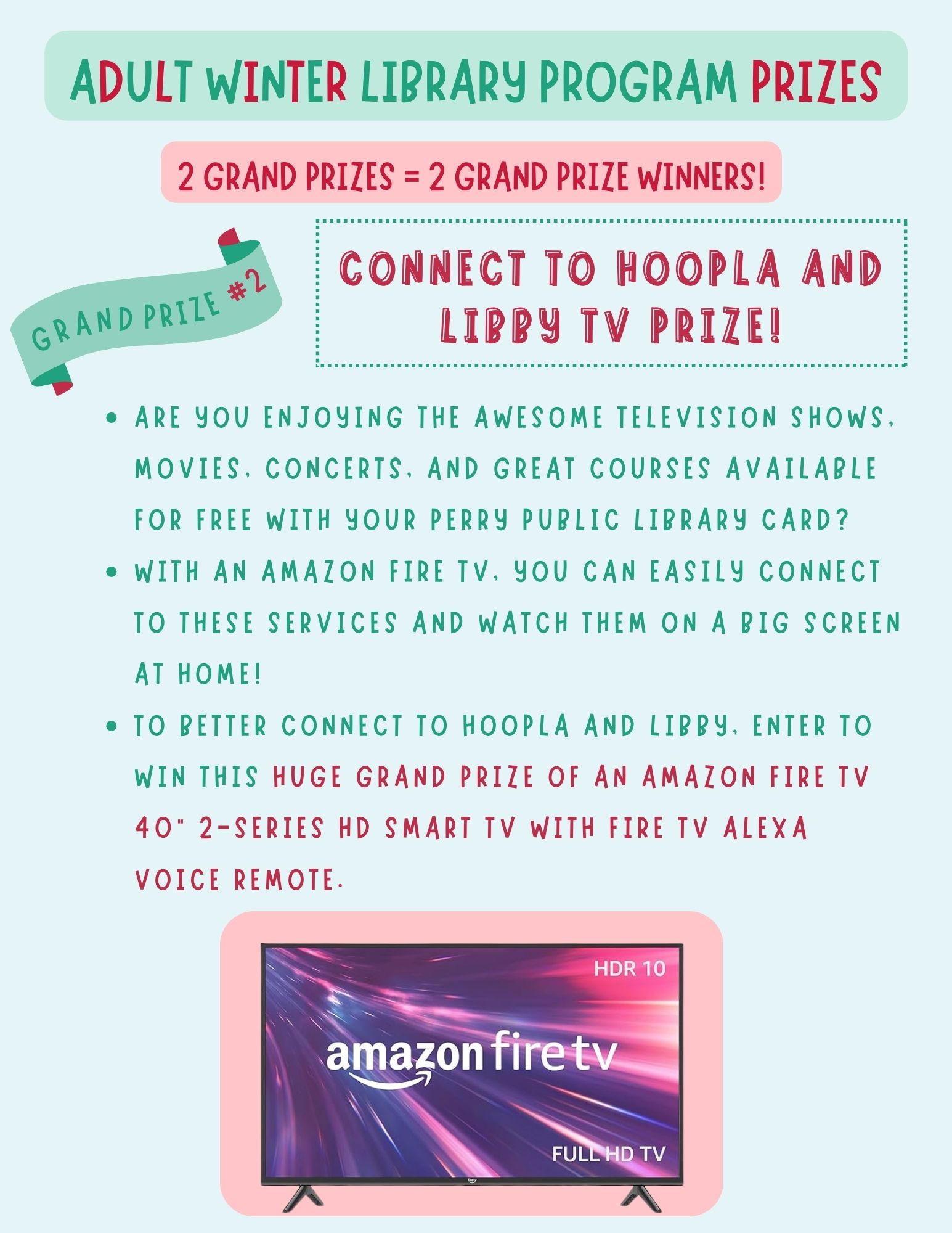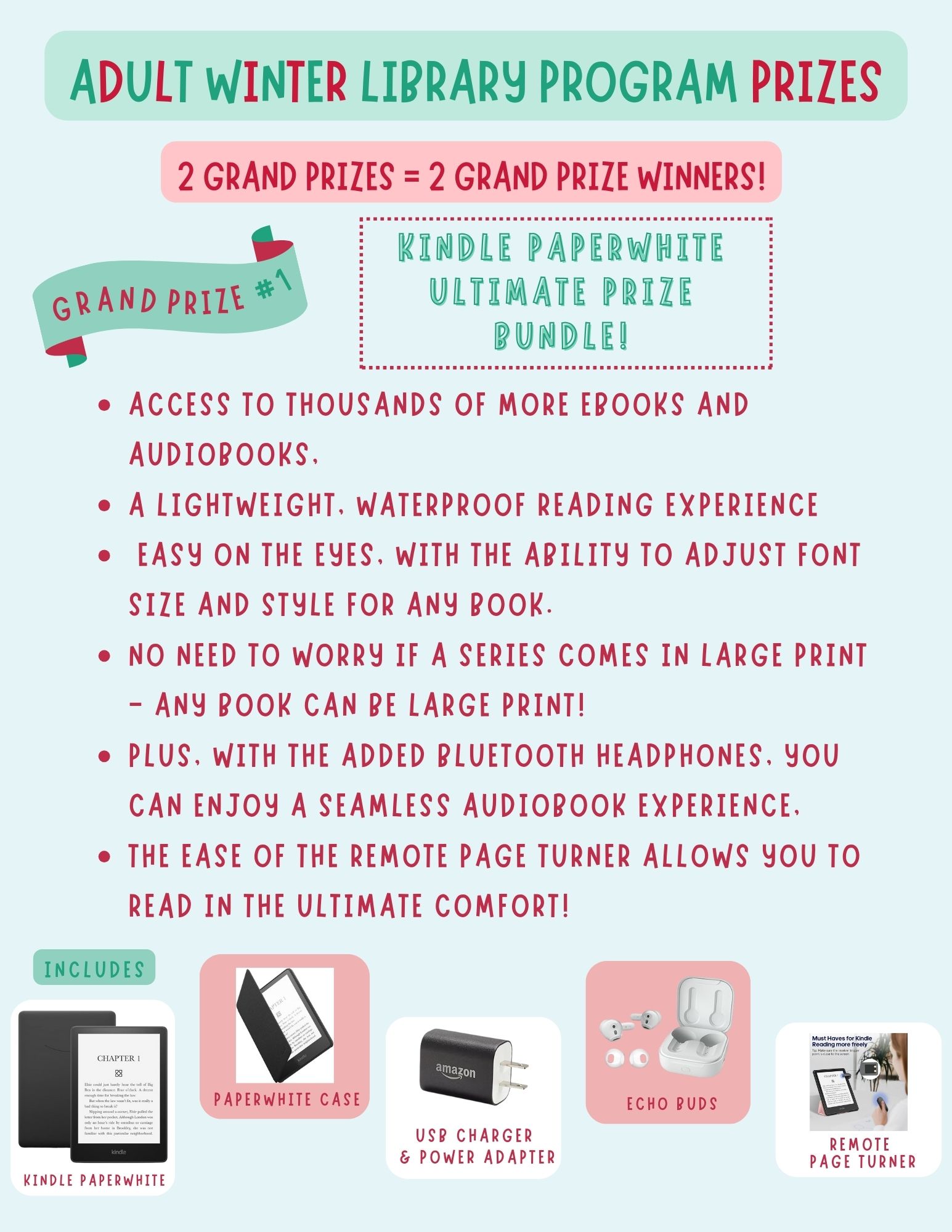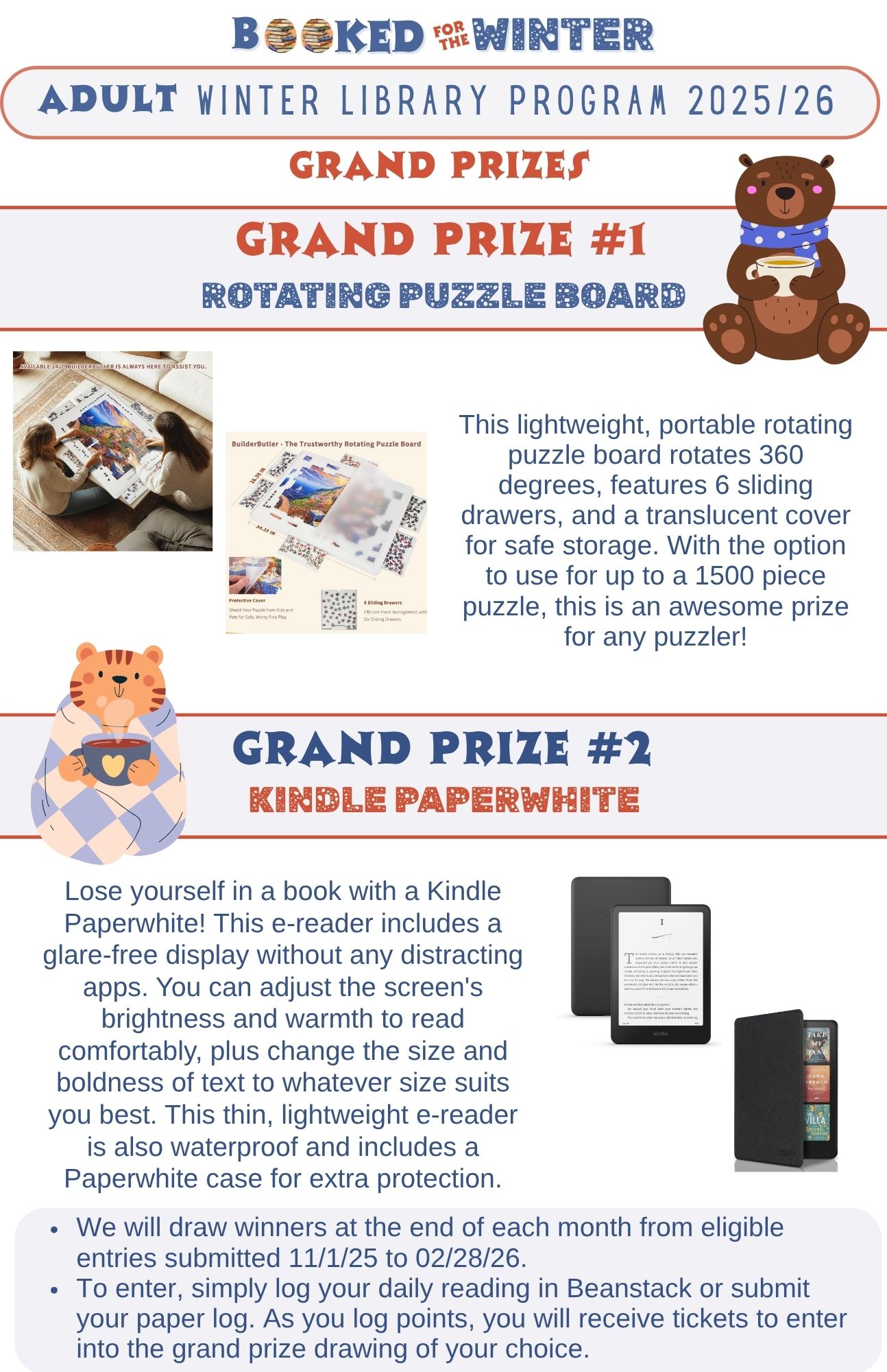This year, adults will earn points for entries into our bi-monthly Mini Prize Drawings for things you’ll love to use when you’re “booked for the winter!”. Plus, you can earn Grand Prize Tickets and choose which grand prize you would like a chance to win – A rotating puzzle table or a Kindle Paperwhite! Want an extra challenge? Join our Adult Winter Library BINGO! and earn entries into monthly drawings for local business gift cards.