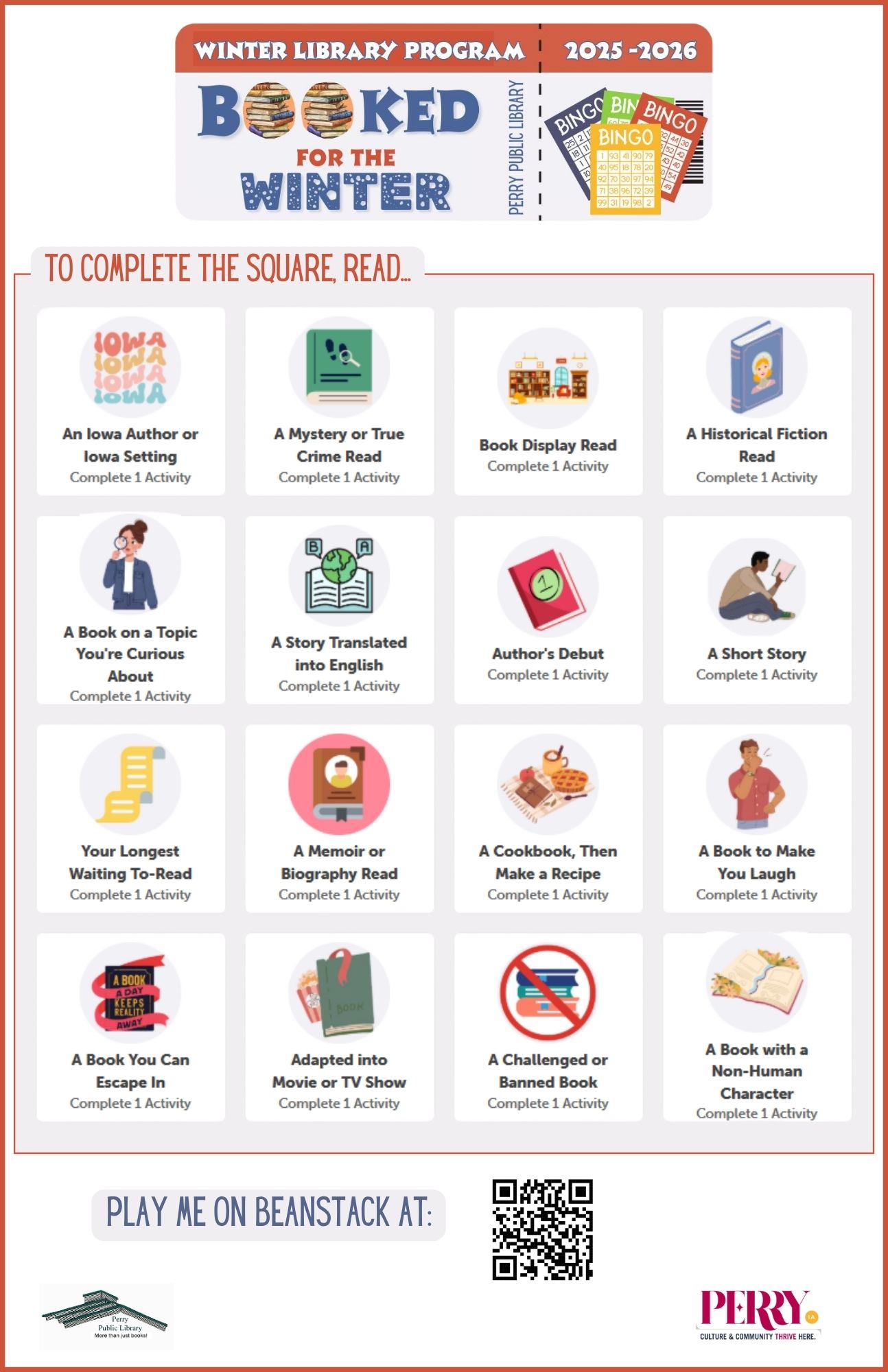 Ready to be “Booked for the Winter” with your Perry Public Library? Visit the circulation desk beginning December 1st for help with registration or sign into the Beanstack app and register for our Winter Library Program. This is a free program and registration is required. Please call 515-465-3569 or visit www.perry.lib.ia.us with any questions.