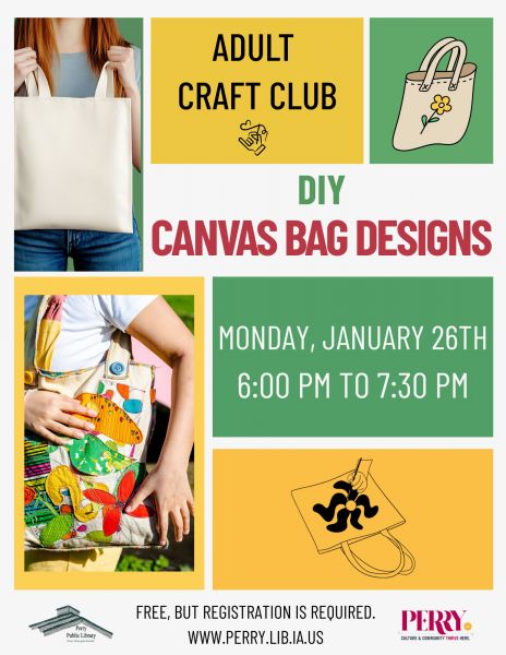 Upcoming Monthly Adult Craft Club Meeting January Adult Craft Club: DIY Canvas Bag Designs | Monday, January 26th The class is free, but spots are limited, and registration is required. Visit our Events Calendar and click on the class in the current month to register. Recorded Craft Club Programs Previous Craft Club events DIY Patriotic T-Shirt Transfer DIY Patriotic T-Shirt Transfer Materials and Instruction List DIY Gerbera Daisy Paper Bouquet DIY Gerbera Daisy Paper Bouquet Materials and Instruction List DIY Front Door Sign DIY Front Door Sign Materials and Instruction List DIY Coasters DIY Coasters Materials and Instruction List Snowman Shadow Box Snowman Shadow Box Materials and Instruction List Ombre Wood Pumpkin Sign Ombre Wood Pumpkin Materials and Instruction List