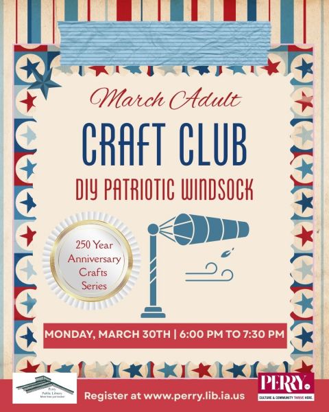 Upcoming Monthly Adult Craft Club Meeting March Adult Craft Club: DIY Patriotic Windsock| Monday, March 30th | 6:00 pm to 7:30 pm The class is free, but spots are limited, and registration is required. Visit our Events Calendar and click on the class in the current month to register. Recorded Craft Club Programs Previous Craft Club events DIY Patriotic T-Shirt Transfer DIY Patriotic T-Shirt Transfer Materials and Instruction List DIY Gerbera Daisy Paper Bouquet DIY Gerbera Daisy Paper Bouquet Materials and Instruction List DIY Front Door Sign DIY Front Door Sign Materials and Instruction List DIY Coasters DIY Coasters Materials and Instruction List Snowman Shadow Box Snowman Shadow Box Materials and Instruction List Ombre Wood Pumpkin Sign Ombre Wood Pumpkin Materials and Instruction List