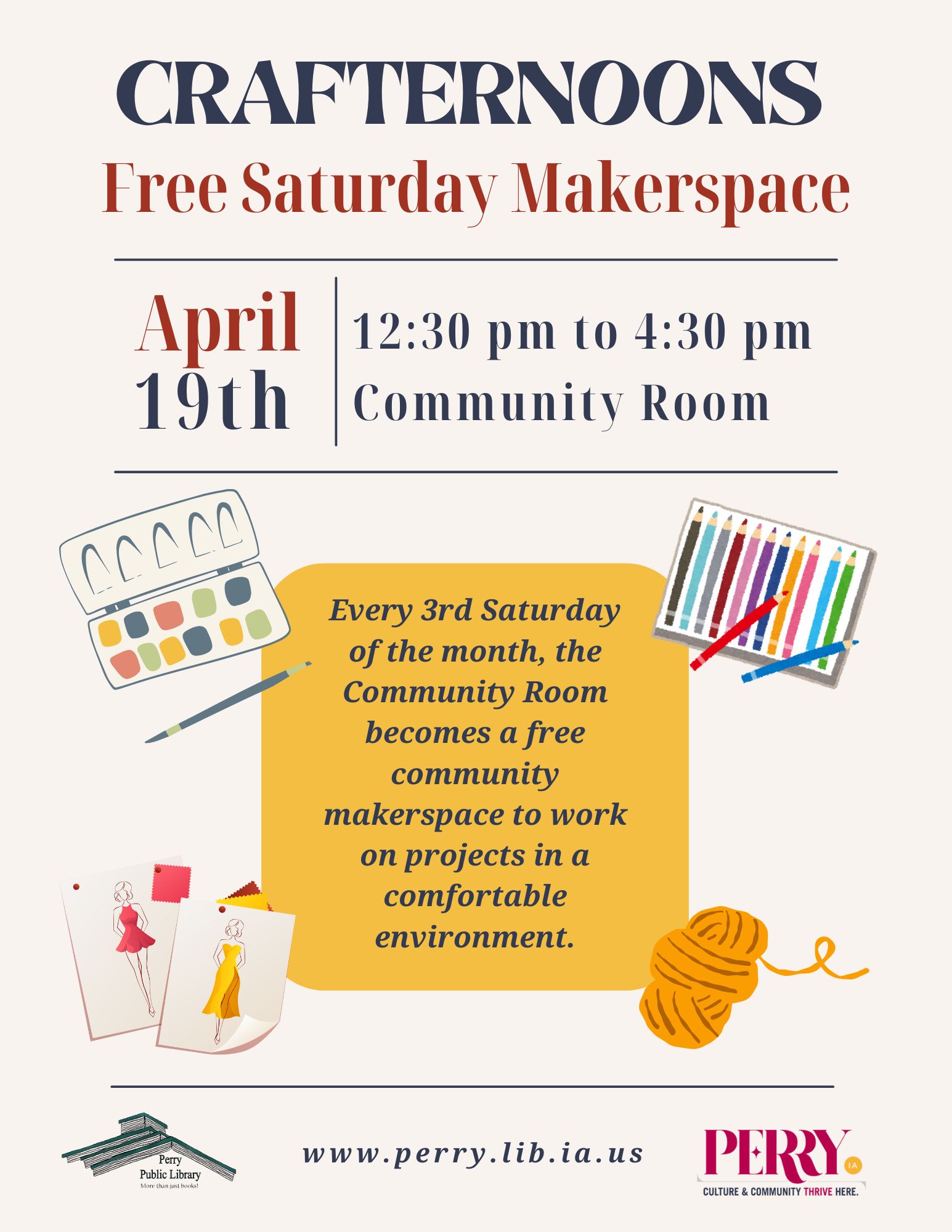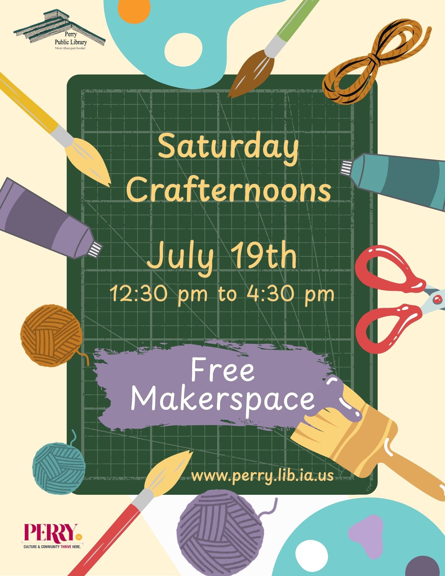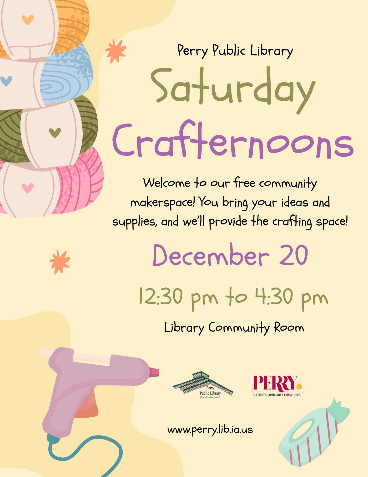 Are you looking for a quiet, community space to craft? Then, we have the perfect Saturday event for you! The Perry Public Library welcomes crafters and do-it-yourselfers to our dedicated makerspace – now following Paper Crafting with Kathy. You bring your ideas and supplies and we’ll supply the crafting space. Saturday Crafternoons last from 12:30 pm to 4:30 pm in the Library Community Room and offer a free community space to work on projects in a comfortable environment. Plan your next work session for Saturday, December 20th, at the library. Tables are available on a first-come, first-served basis, and everyone is invited. No reservations and no charge! For more information, go to www.perry.lib.ia.us, visit the library, or call 515-465-3569.