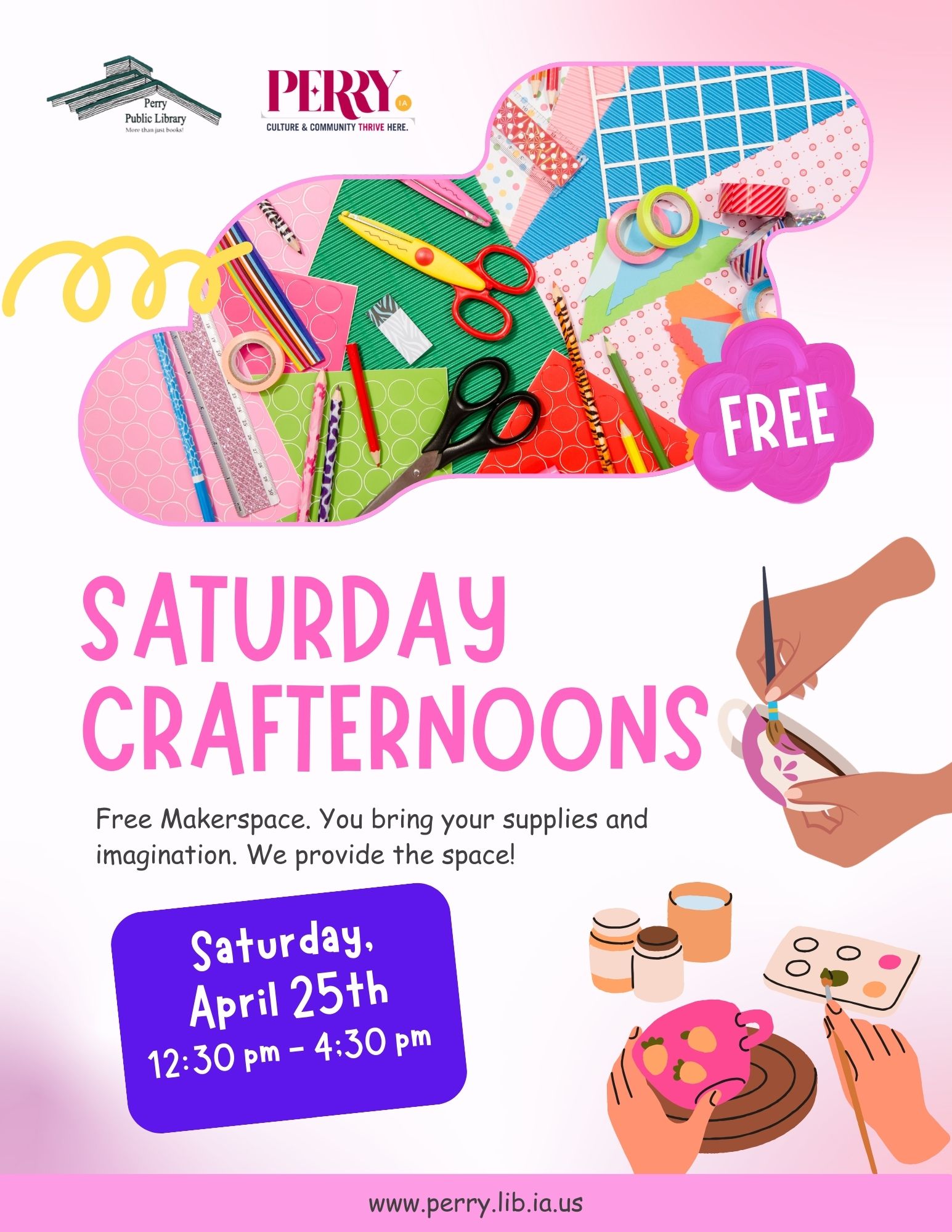 Are you looking for a quiet, community space to craft? Then, we have the perfect Saturday event for you! The Perry Public Library welcomes crafters and do-it-yourselfers to our dedicated makerspace – now following Paper Crafting with Kathy. You bring your ideas and supplies and we’ll supply the crafting space. Saturday Crafternoons last from 12:30 pm to 4:30 pm in the Library Community Room and offer a free community space to work on projects in a comfortable environment. Plan your next work session for Saturday, April 25th, at the library. Tables are available on a first-come, first-served basis, and everyone is invited. No reservations and no charge! For more information, go to www.perry.lib.ia.us, visit the library, or call 515-465-3569.