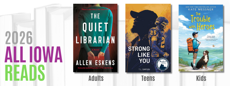 Established in 2003, the purpose of All Iowa Reads is to foster a sense of unity through reading. Iowans are encouraged to come together in their communities to read and talk about a single book title in the same calendar year. All Iowa Reads consists of three programs, each with one title chosen per year: adults, teens ages 12-18, and kids ages 8-12. We will read the Adult Iowa Reads selection for the April Monthly Book Club.