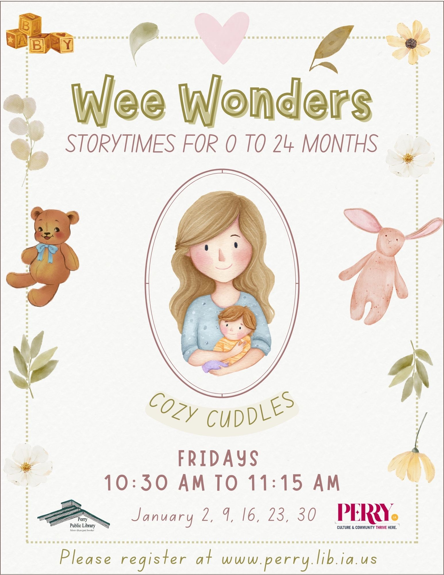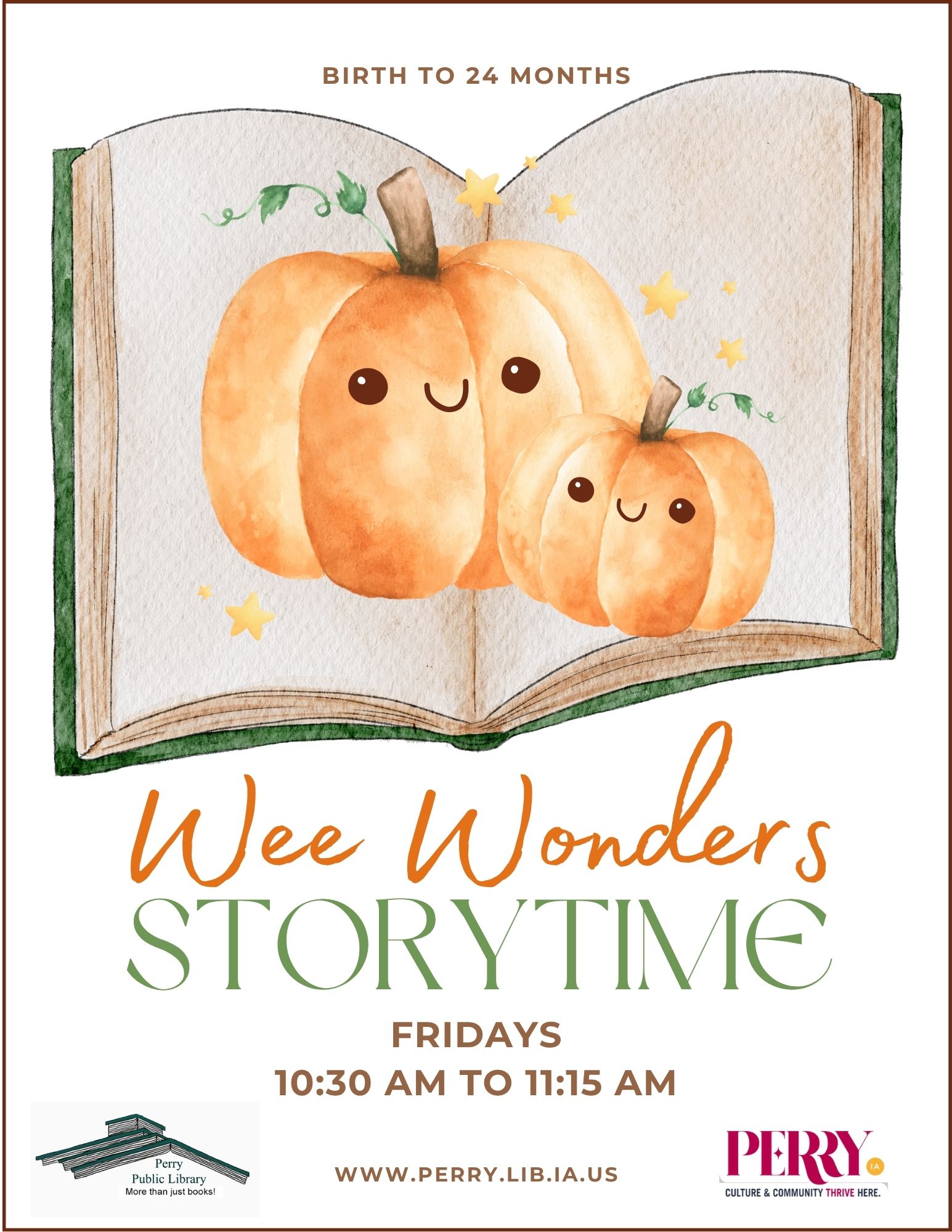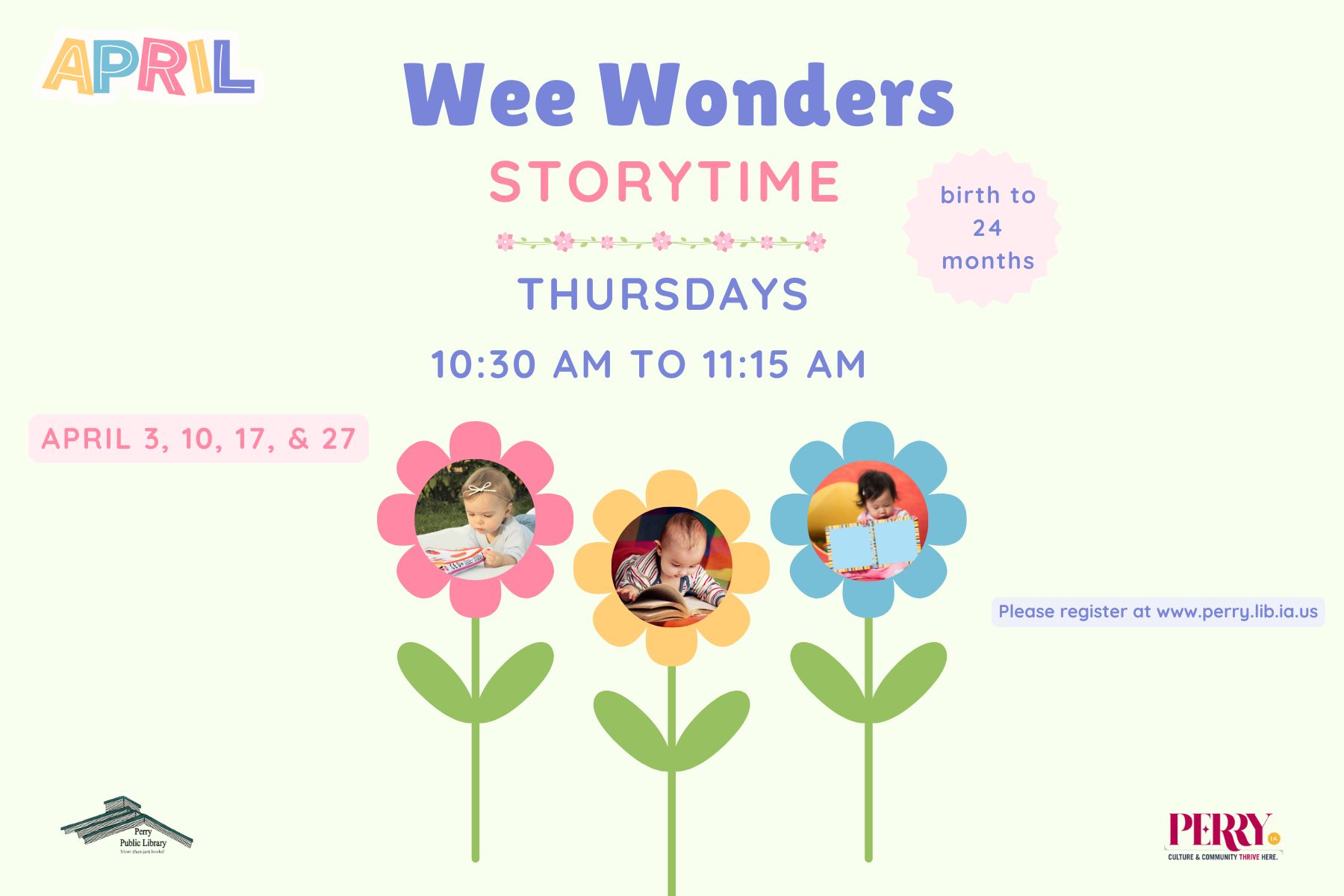 Wee Wonders is an early literacy lapsit program for babies birth through 24 months and their caregivers. We sing songs and rhymes, read simple books, do fingerplays and bounces, and incorporate motor skills with shakers and scarves. There is also a period of social play at the end of each program. Plus, each participating baby gets a free board book every time they come to the program. Please register.