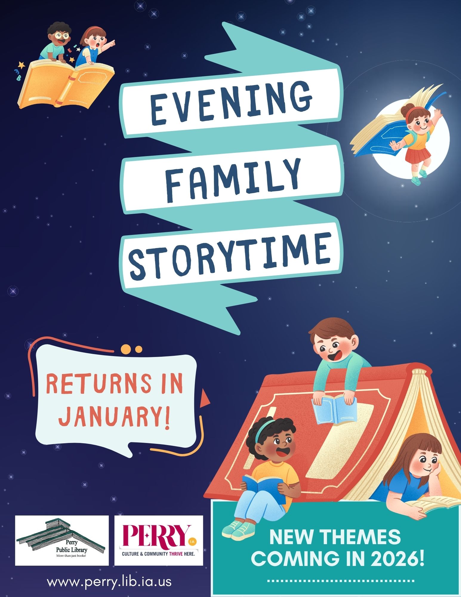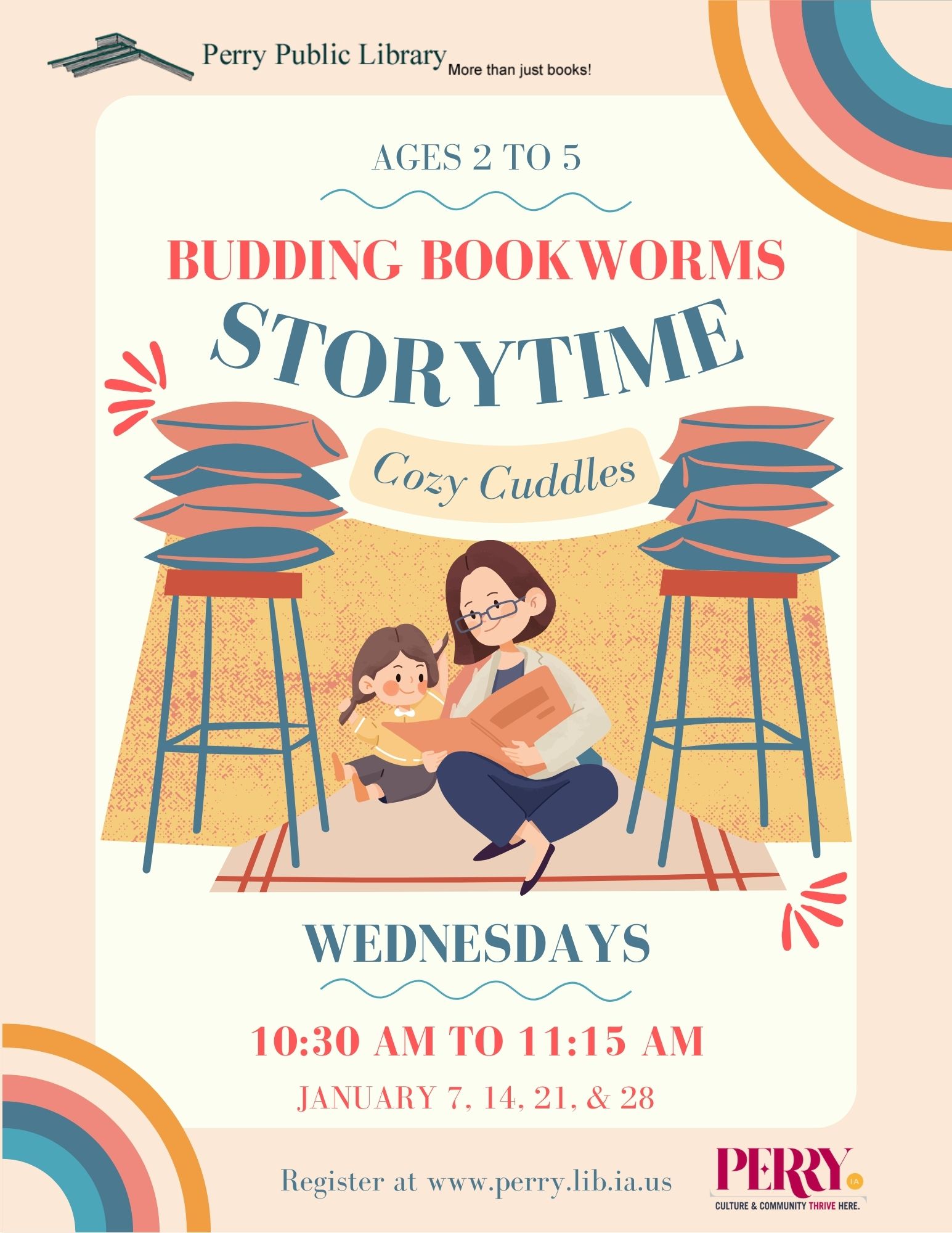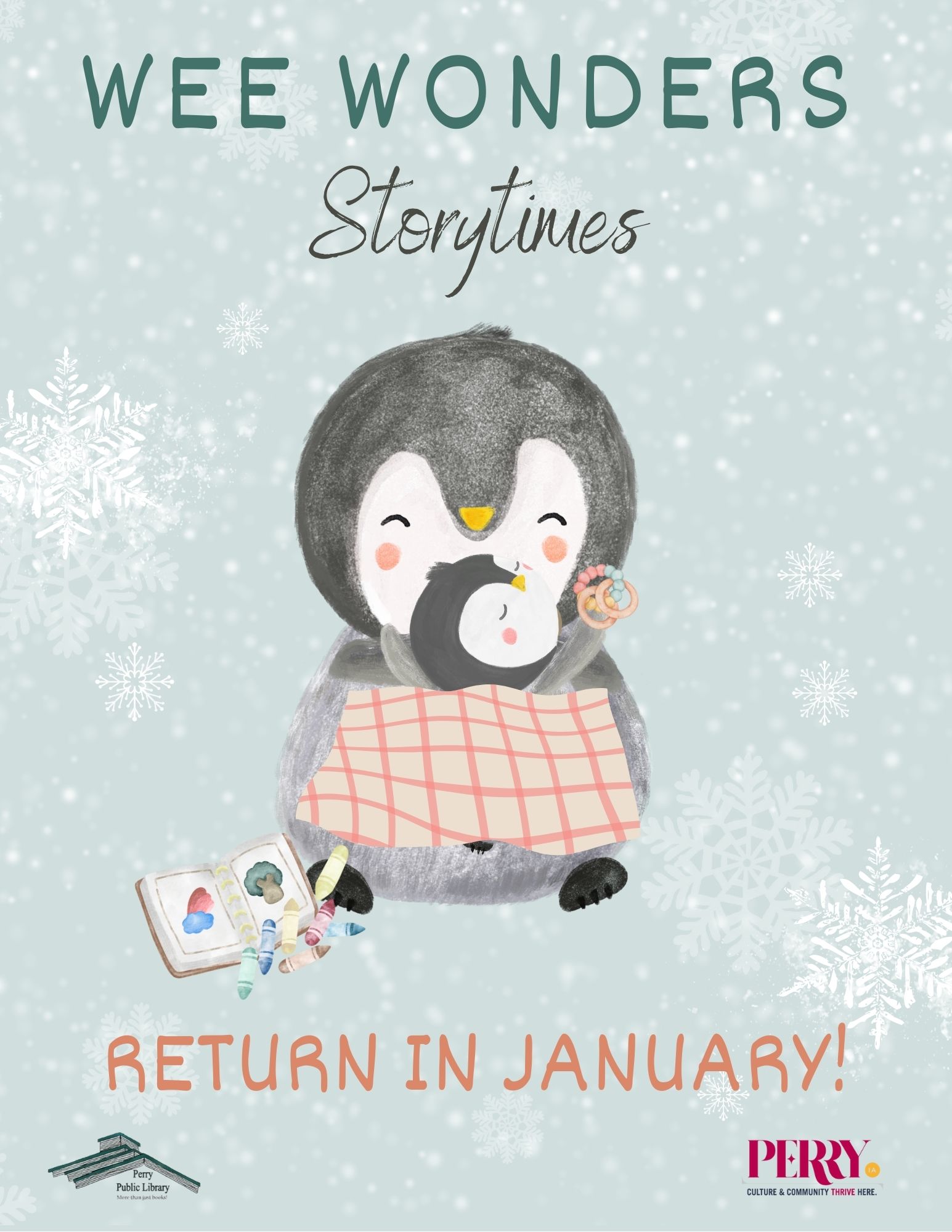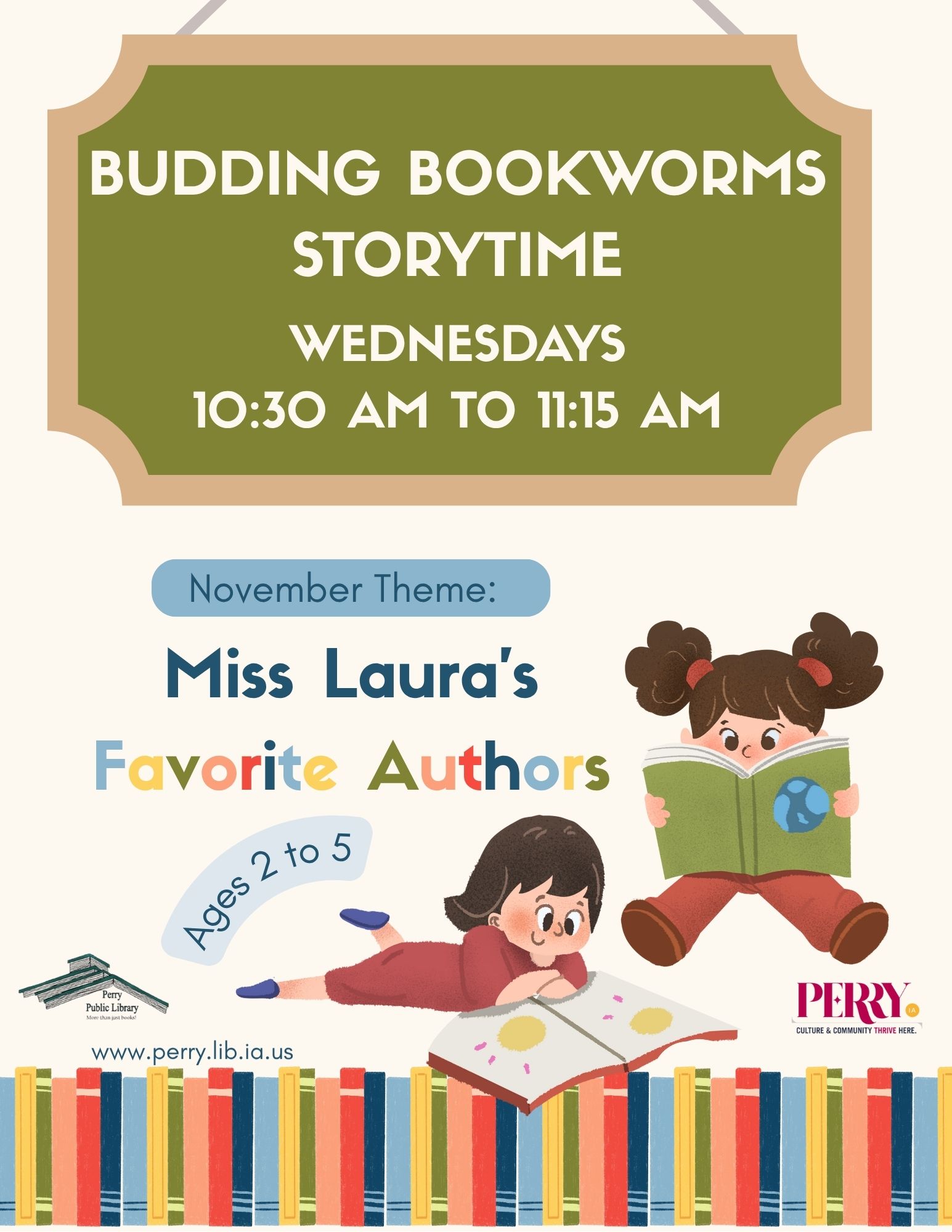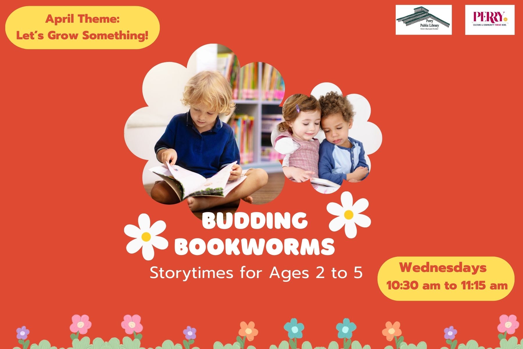The Perry Public Library is excited to announce our new storytime, Budding Bookworms, which combines our Toddler and Preschool storytimes into a fun, engaging 45-minute program that includes books, singing and dancing, and simple crafts. Our goal is to provide caregivers with an opportunity to introduce their children to good literature, encourage growth in children's literacy skills (reading, talking, singing, playing, and writing), and promote the library as an enjoyable place where learning is fun. Please register.