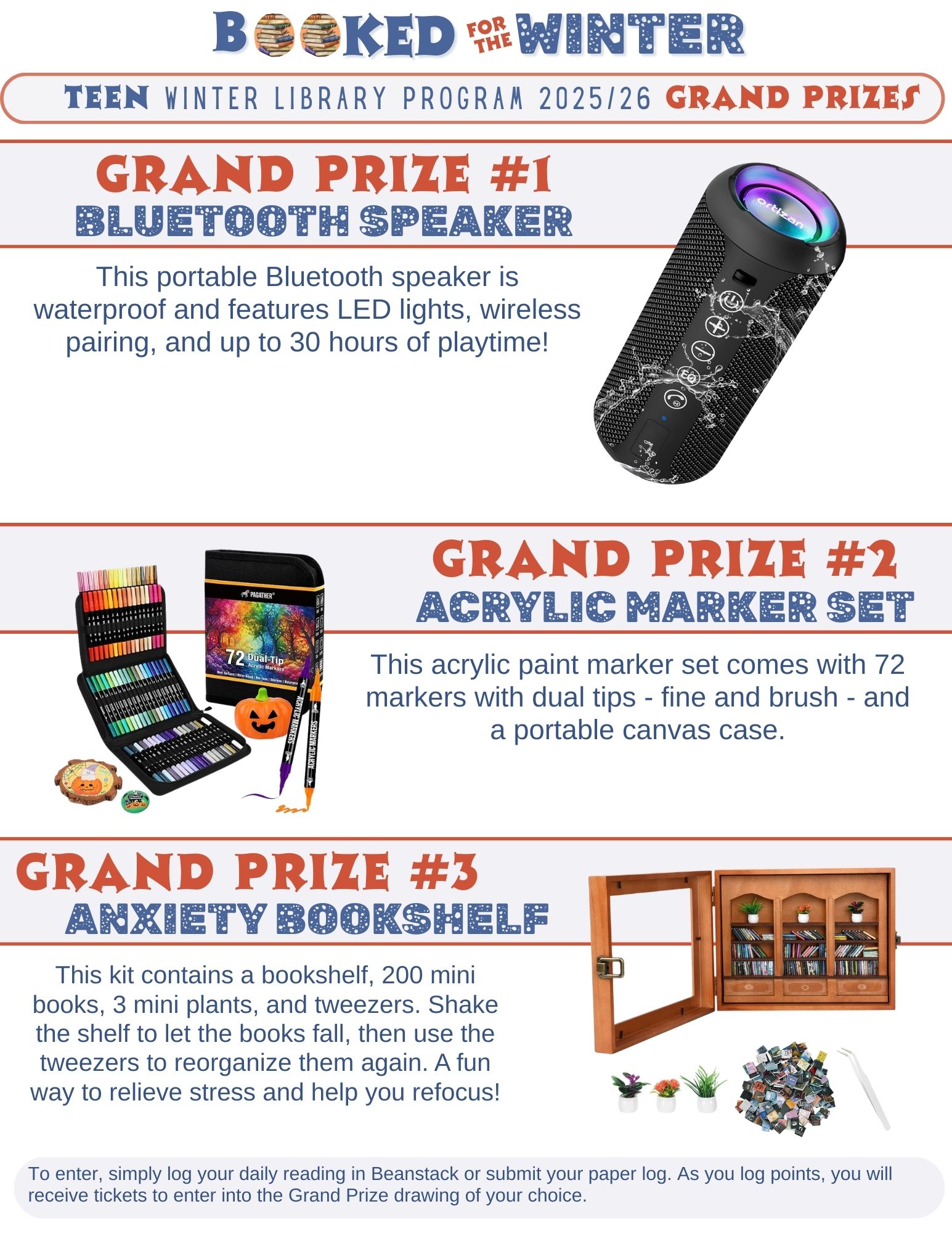 Teen reading points will add up for awesome mini-prizes they can collect all season. Plus, every teen has the opportunity to earn up to 4 free books! You can also earn Grand Prize Tickets and choose which grand prize you would like a chance to win – a portable Bluetooth speaker, an acrylic paint marker set, or an anxiety bookshelf stress relief set!