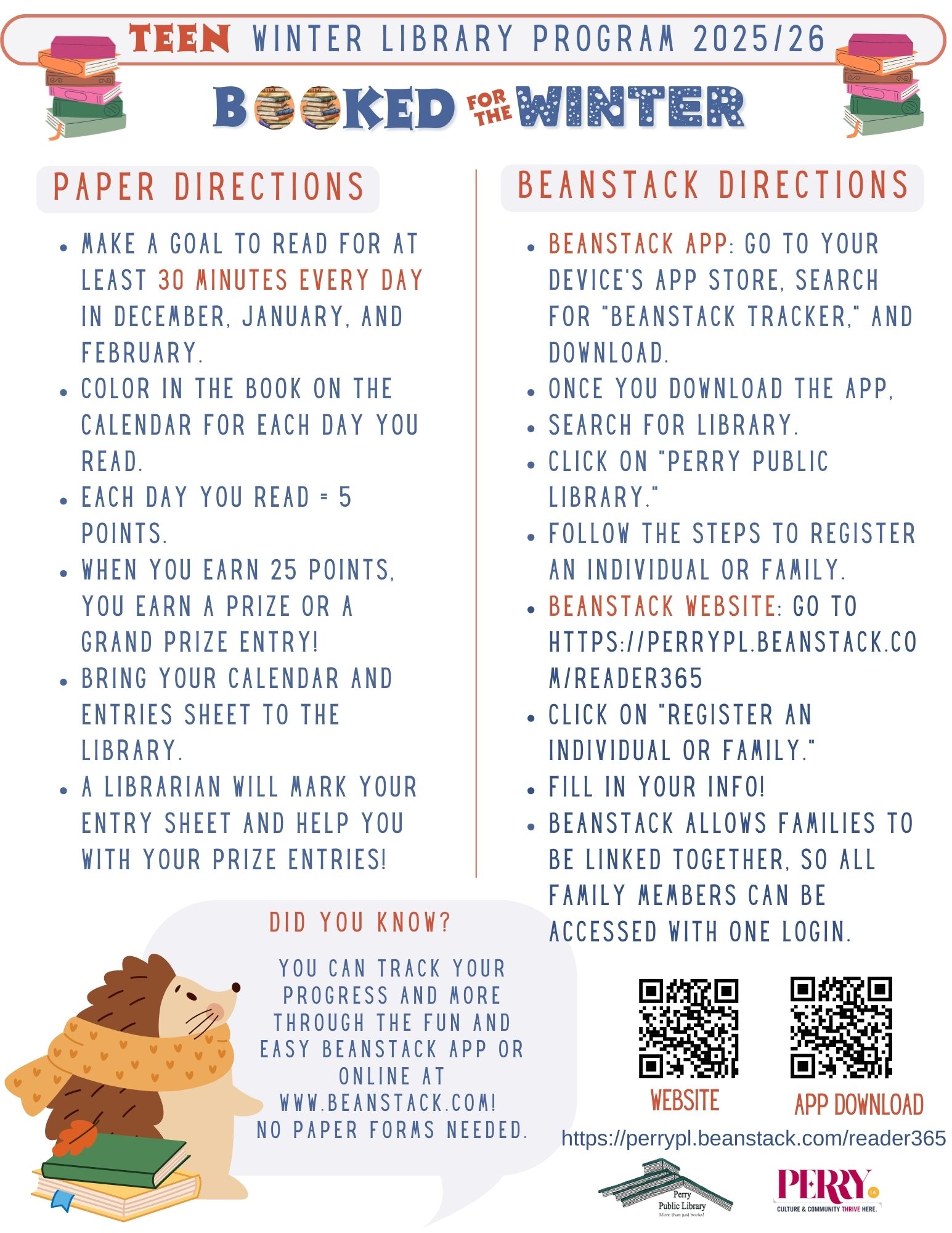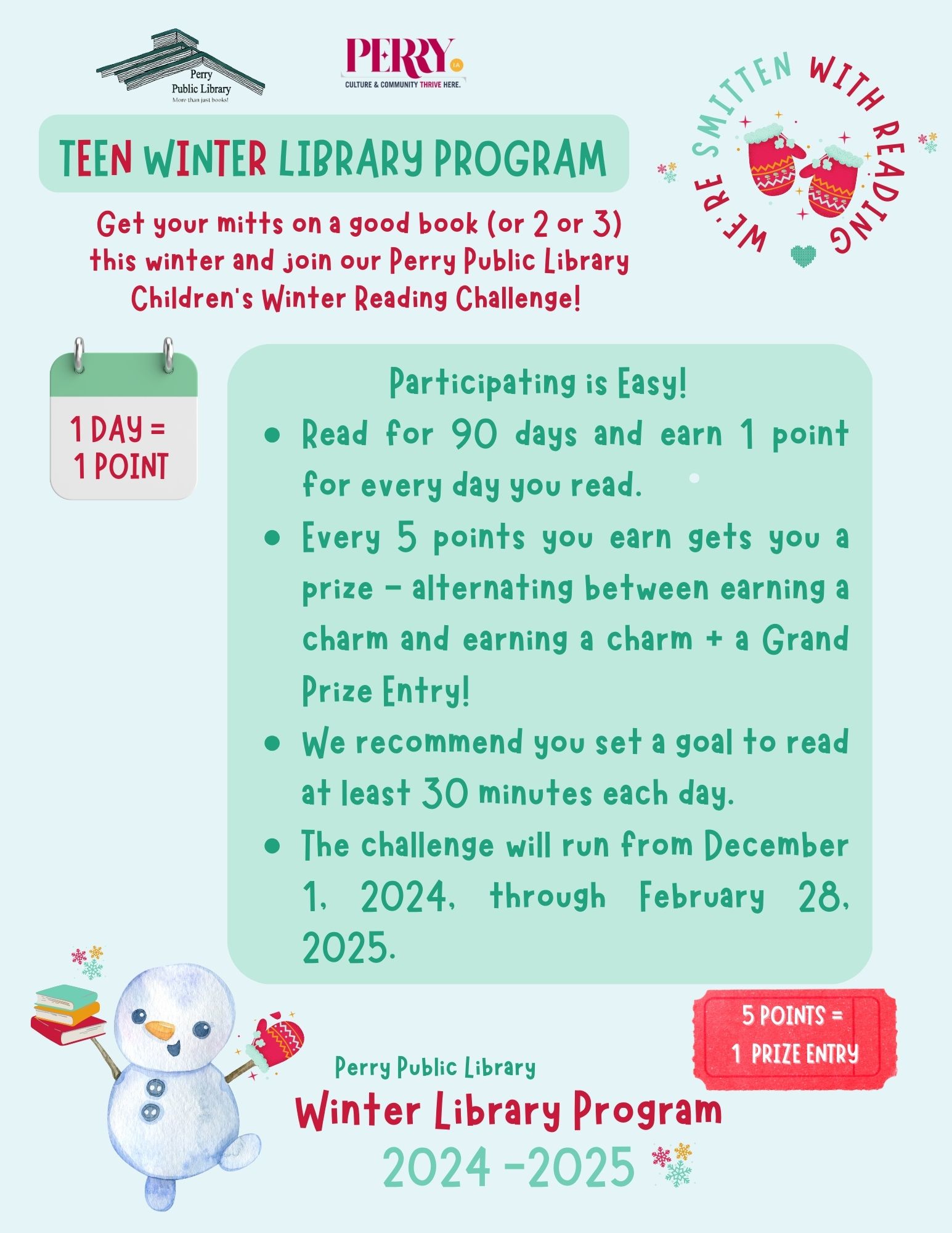 We're "Booked for the Winter" at the Perry Public Library from December 1st, 2025, until February 28th, 2026! You're invited to join our one of our Adult, Teen, or Children’s Winter Library Programs. Participants can register beginning December 1st and start earning points just for enjoying the perfect winter activity - reading! To participate, simply track each day you read on paper or on the Beanstack app. You'll earn points toward fun prizes and awesome grand prize entries!